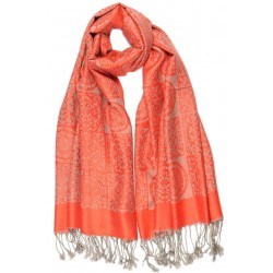 Foulard pashmina femme et homme coloris rouge orangé et gris argent en laine mixée soie, chale pashmina pas cher graphisme tendance de plumes et fleurs de lotus discrètes référence Patna collection Léon Montane, taille 200cm longueur, 70cm largeur.
