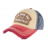 Choisissez une casquette filet Von Dutch rouge bordeaux et bleue référence Mac Wine en toile coton vieilli et souple, casquette baseball homme et femme effet vintage et son logo Von Dutch beige et bleu graphisme ovale tradition Custom, visière arrondie bleue surpiqures beige, filet trucker beige avec oeil ailé.