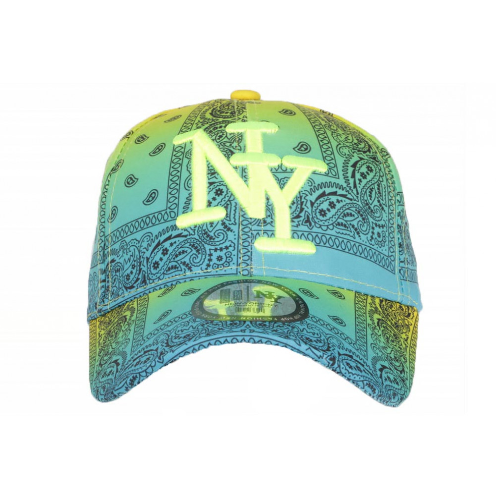 Achat casquette bandana bleue et jaune fluo design été lumineux et city mode cool collection Hip Hop Honour, casquette NY homme et femme en tissu imprimé bandana original, visière baseball tendance, NY brodé jaune fluo en 3D et sticker New York Original, taille réglable.