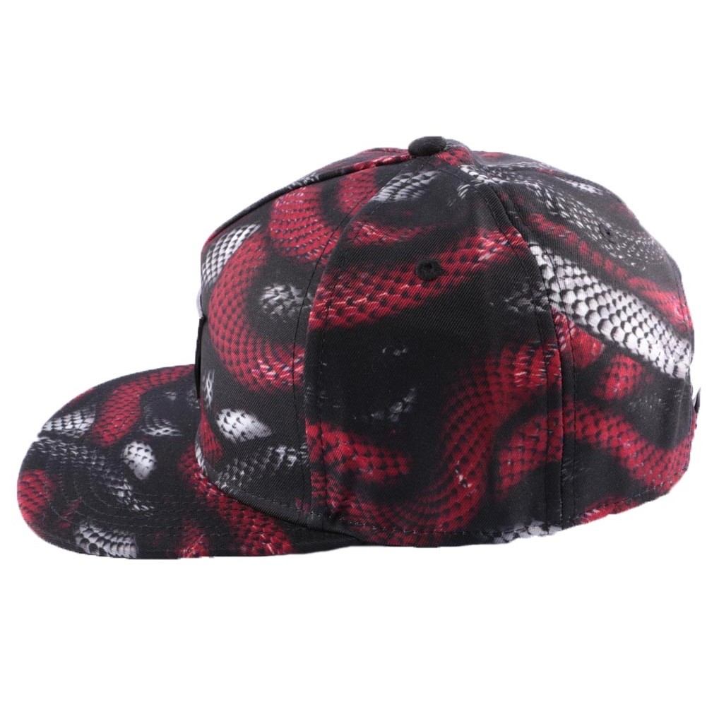 Casquette Snapback de la marque Cayler & Sons rouge et noir. Cette Snapback originale est dans un tissu imprimé technologie qui montre des serpents, sur le devant on trouve le logo de la marque et sur l'arrière l'attache de réglage.