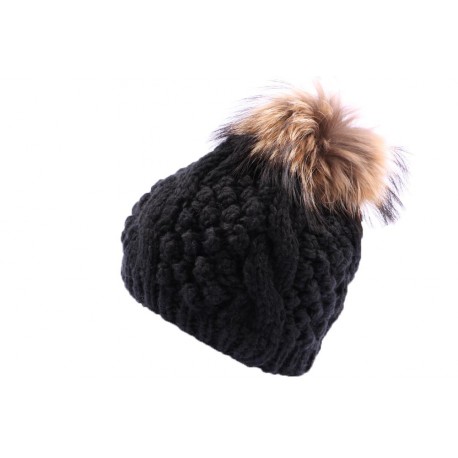 Bonnet de la marque Nyls Création de couleur noir, ce bonnet en laine noir est surmonté d'un pompon en imitation marmotte.
