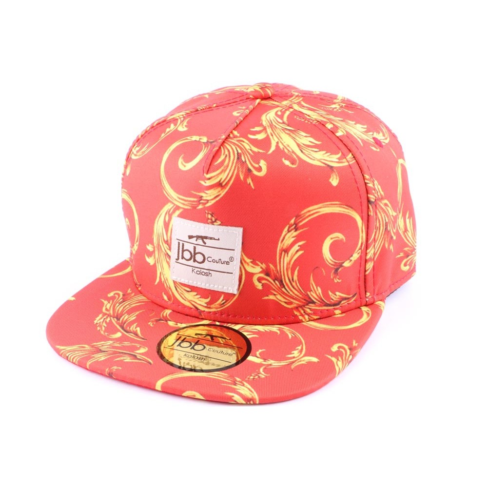 Casquette Snapback de la marque JBB couture, cette casquette est orange avec un imprimé Or sur le devant on retrouve la Griffe avec la Kalash.