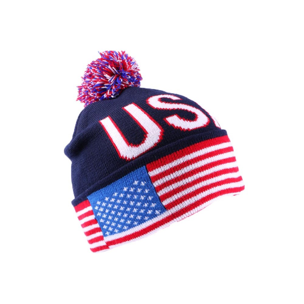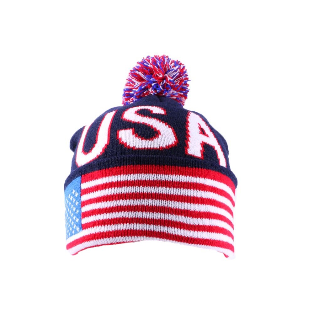 Bonnet de la marque Nyls Création, ce bonnet est de couleur bleu avec un drapeau US dessus. On retrouve un pompon sur le dessus.