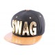 Casquette de la marque JBB Couture, cette casquette est de forme Snapback, elle à une plaque or sur le devant avec écrit Swag. Le top est noir et la visière marron. Sur l'arrière on retrouve l'attache de réglage pour la taille.