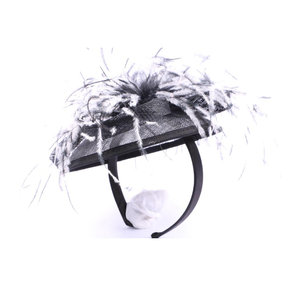 Serre tête Cérémonie Charline en sisal Noir, Plumes Bicolores Noires blanches