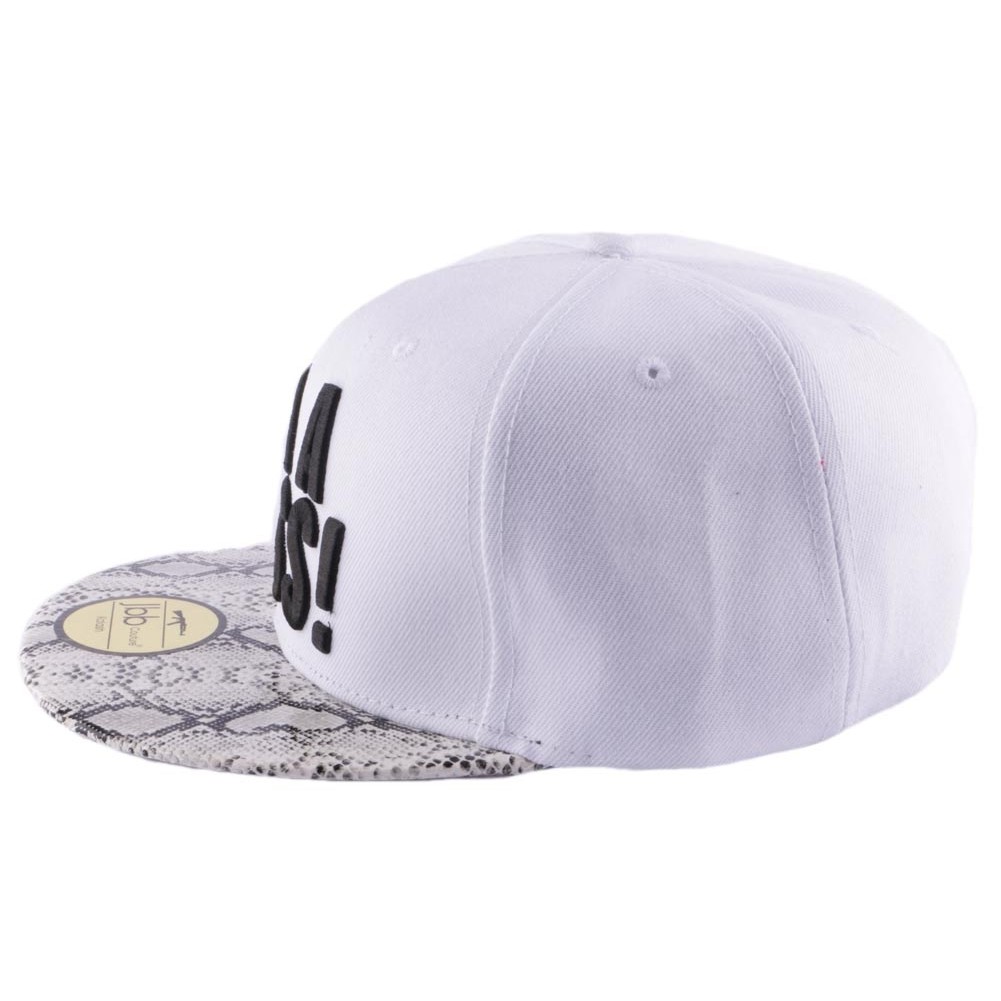 Casquette de la marque JBB Couture, cette snapback de couleur blanche à la visière façon serpent. Sur le devant il est écrit I'm a Boss. A l'arrière on trouve l'attache de réglage pour la taille.