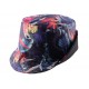 Bob de la marque JBB Couture, ce bob est en impréssion tropical avec des fleurs et des perroquets il est de dominante bleu. Sur le devant on trouve une plaque dorée de la marque. Taille unique