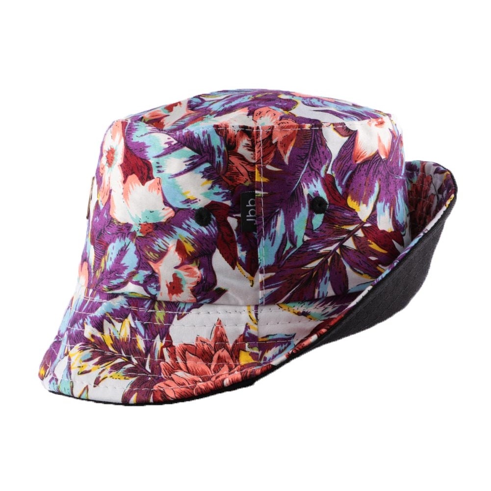 Bob streetwear de la sélection JBB Couture. Le bob est en tissu à fleur turquoise violet et blanche, vous pouvez le retourner pour obtenir un bob sobre en tissu noir uni. Taille unique.