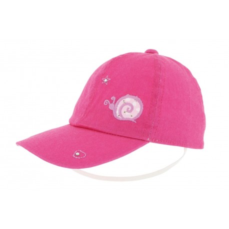 Casquette pour bébé de la marque Essential Herman Headwear, cette casquette est en coloris fuschia avec un dessin d'escargot dessus.