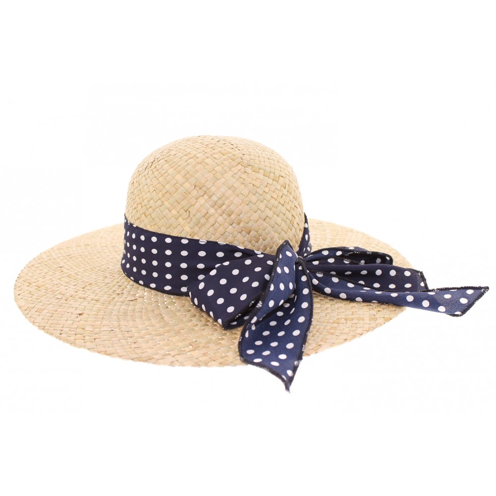 Chapeau en paille de la marque Herman Headwear modèle Clara. Cette capeline été est en paille naturelle, la ceinture est un foulard en vichy bleu pois blanc sur fond bleu marine. Le foulard est noué autour de la calotte laissant partir du noeud deux pans retombant sur la lame. Capeline de paille classe pour être mode et tendance cet été.