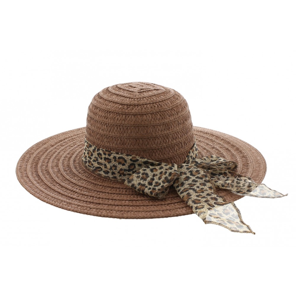 Chapeau de paille de rafia marque Herman Headwear référence Clara. Ce modèle est une capeline en coloris marron garni d'un foulard léopard. Esprit style et glamour et pour cette capeline été à prix sympa.