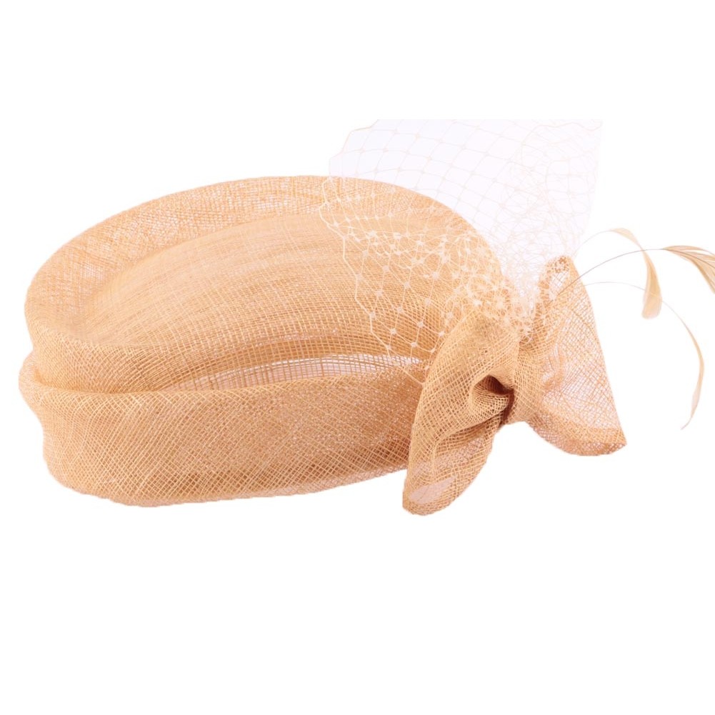 Chapeau de cérémonie de la marque Léon Montane, ce calot mariage est en sisal beige, il est garni d'un noeud en sisal avec de la voilette et des plumes.