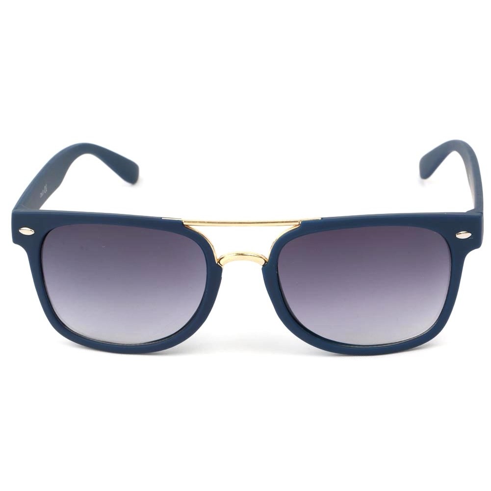 Lunettes de Soleil Eye Wear, lunettes de soleil Catégorie 3 CE, la monture est bleu avec une branche dorée, les verres sont légèrement fumés bleu.