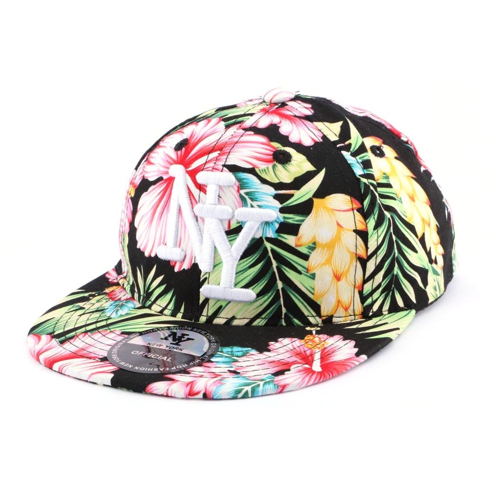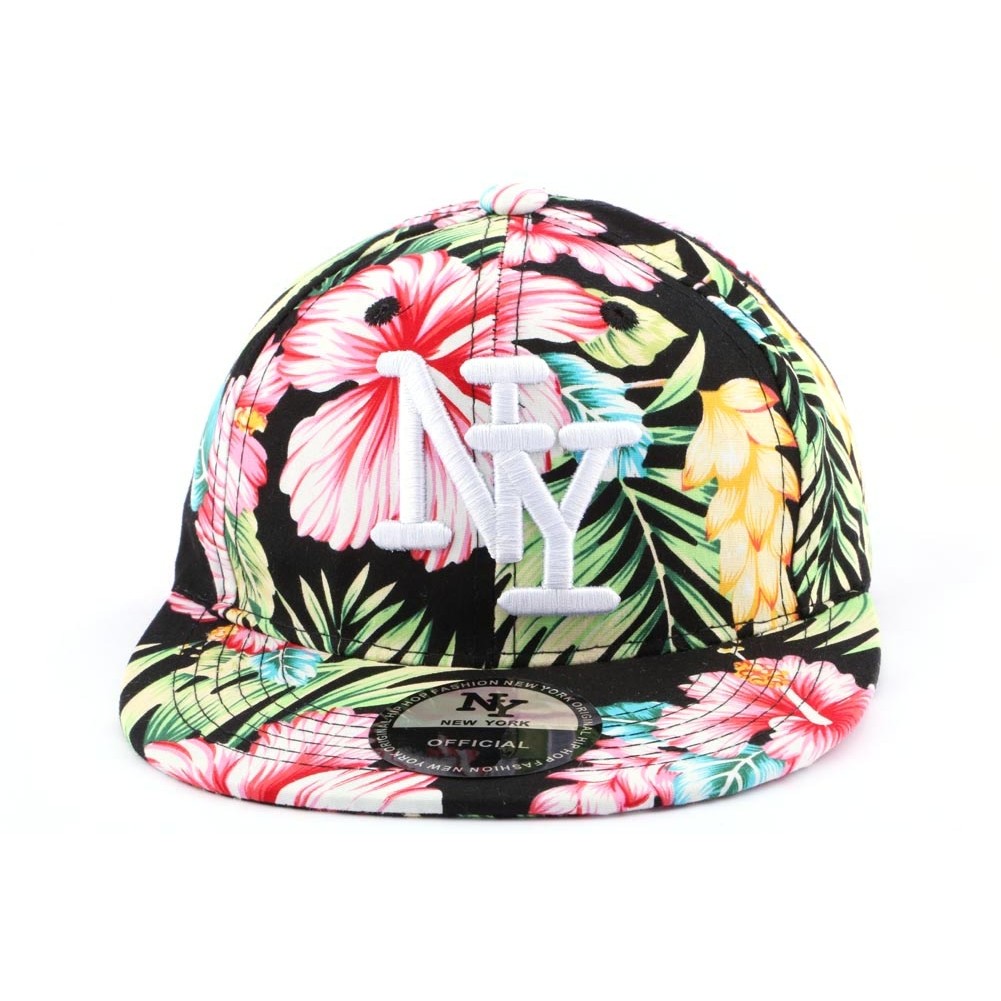 Casquette snapback Enfant noire à fleurs marque Hip Hop Honour taille 1 à 4 ans. La casquette est en tissu léger fond noir avec des fleurs roses, vertes et bleues et un feuillage vert. NY de New York est brodé en blanc sur le top. 6 oeillets permettent une bonne ventilation des cheveux. L'attache de réglage de la snapback enfant est en plastique noir.