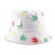 Bob de la marque JBB Couture, nous avons un bob en tissu blanc avec une impréssion de feuillage jaune, rouge et vert. Sur le devant nous avons la plaque de la marque, il est réversible noir. Taille unique.