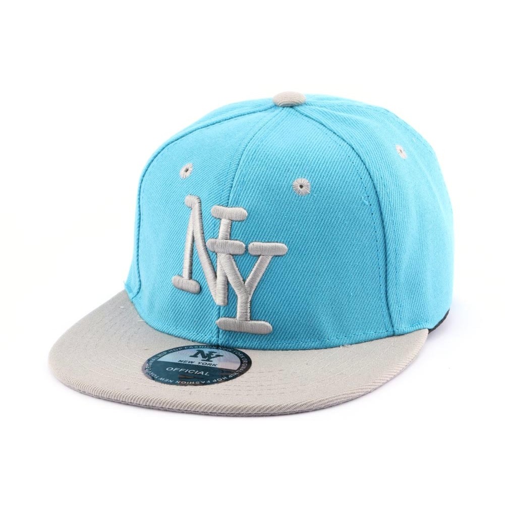 Casquette enfant NY ton Bleu ciel et Gris clair sélection Hip Hop Honour. Cette snapback pour fille et garçon présente son haut en bleu avec en broderie grise le NY de New York; la visière est en gris uni avec l'autocollant NY Official. Trois oeillets sur chaque flanc assure une binne aération des cheveux, le snpa de reglage de taille est gris.