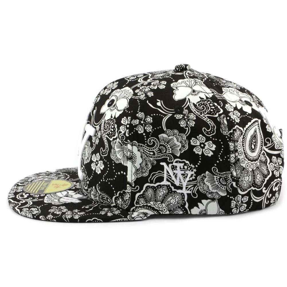 Snapback Noire Richelieu marque Hip Hop Honour. Fabriquée en tissu imprimé, cette snapback montre des motifs à fleurs, feuillages et autres esprits grande époque. Style streetwear et Couture, cette casquette mode est élégante est brodé NY blancs à l'avant sur le côté, l'attache de réglage est en plastique noire.