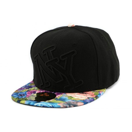 Casquette enfant NY noire, la visière est imprimée de fleurs dans les tons Bleu, violet et vieux rose - Snapback convenant aux enfants de 7 à 12 ans.