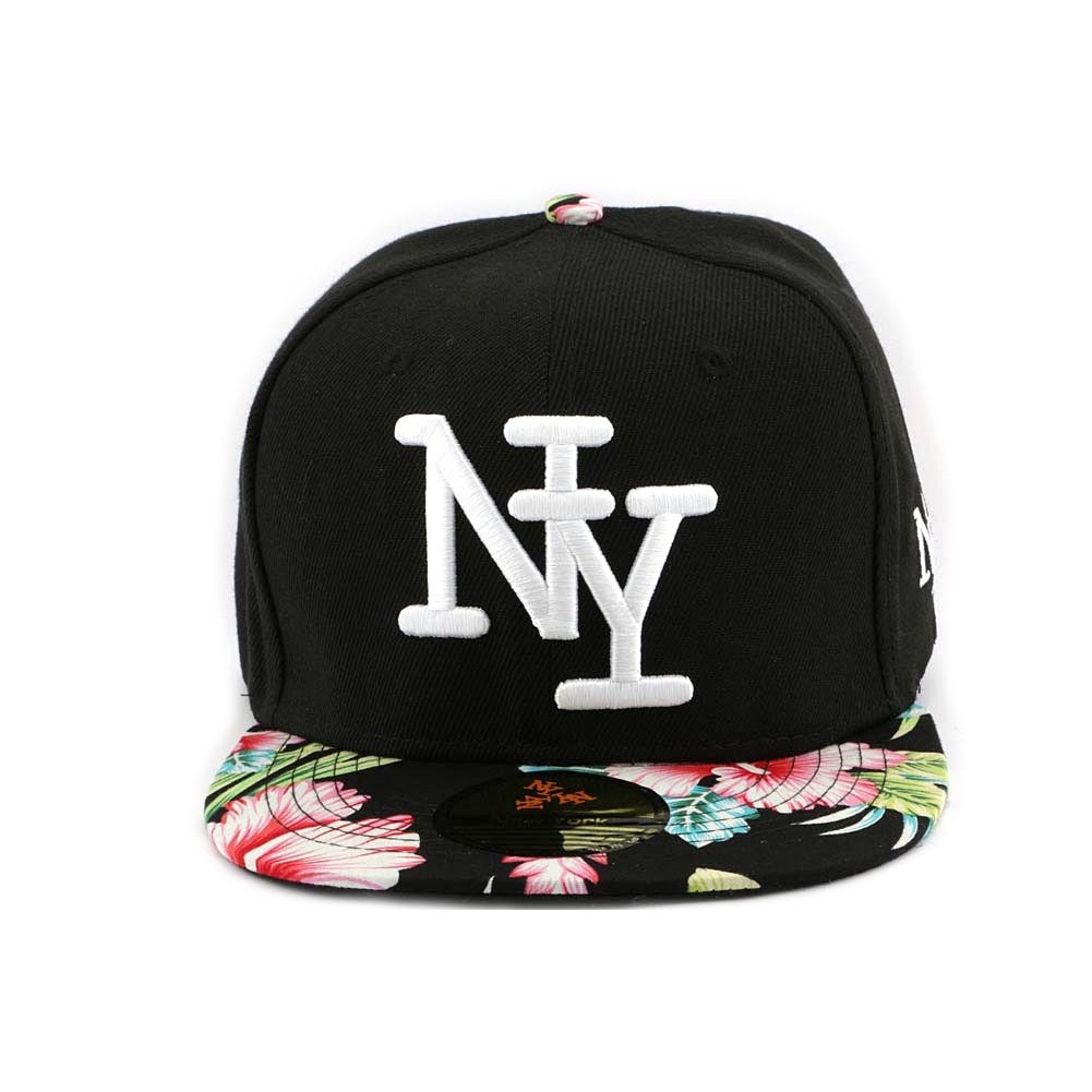 Snapback enfant New York Noir avec fantaisie florale Rose et Bleue marque Hip Hop Honor. Cett casquette destinée aux 7 à 12 ans présente un top noir avec en broderie blanche NY sur le front et New York style calligraphie sur l'arrière. La visière est en tissu avec des impressions de fleurs aux teintes roses, bleues et vertes. Le snap de taille de la casquette est noir.