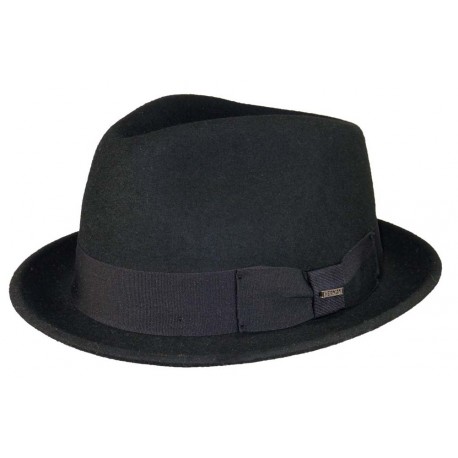 Chapeau de feutre de la marque Herman Headwear modèle Macaldo, ce chapeau à petit bord est en feutre noire, il est garni d'un gros grain ton sur ton avec un noeud chapelier.