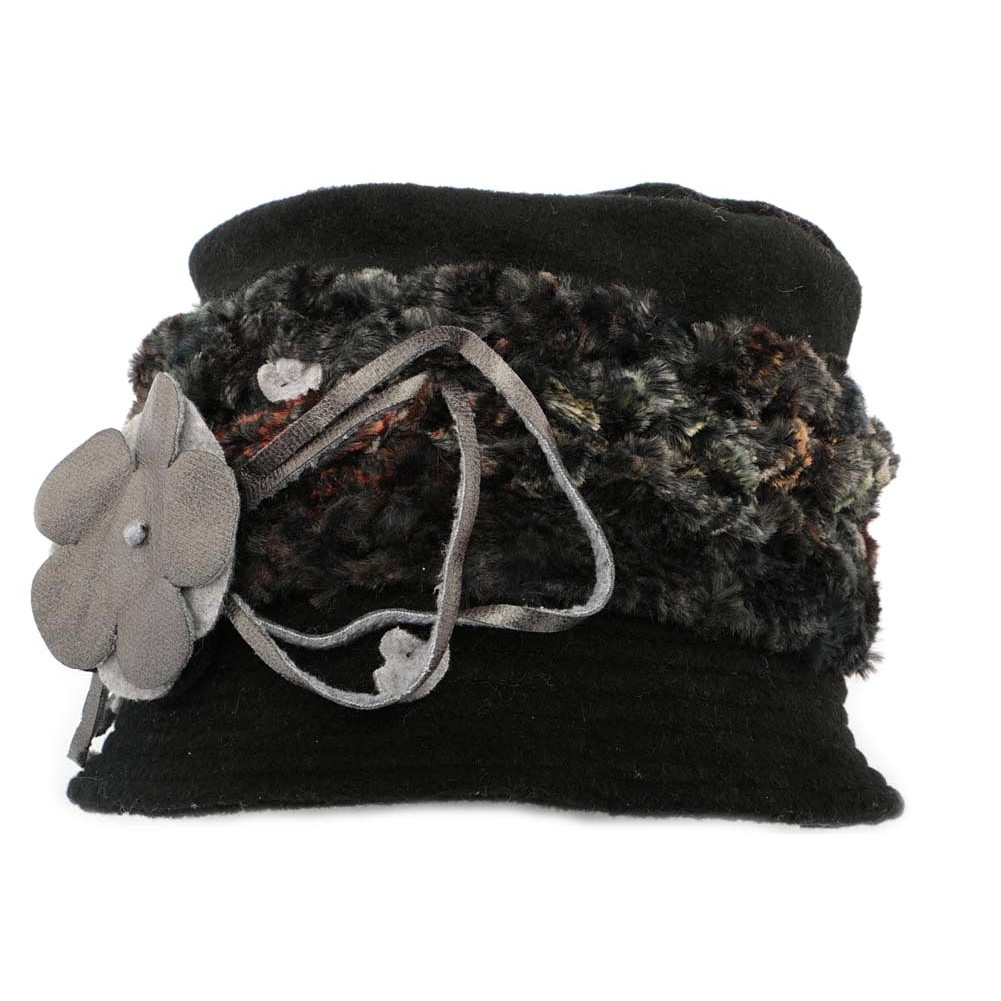 Toque Femme Noire en laine bouillie modèle Louisa gamme Léon Montane - Chapeau de laine rétro avec fourrure et fleur