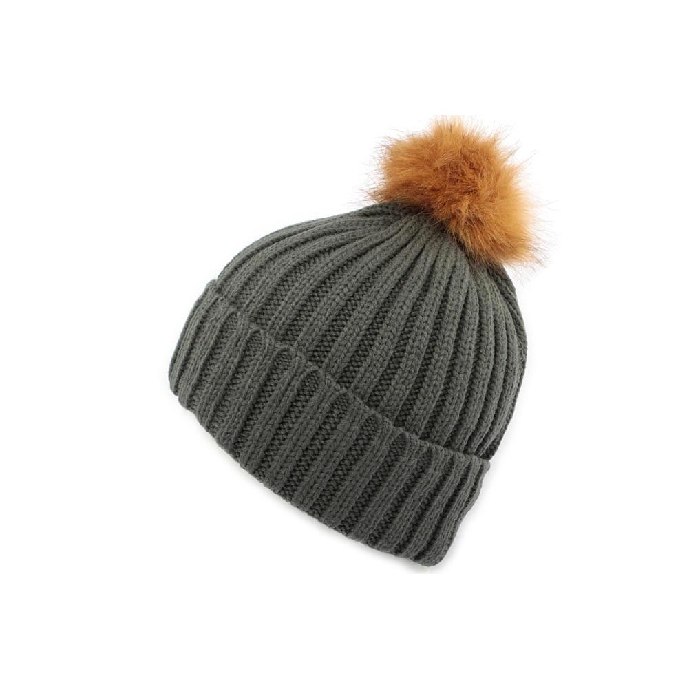 Bonnet à pompon coloris gris de la marque Nyls Création modèle Pure. Confectionné en laine grise, ce bonnet est garni d'un pompon en fausse fourrure marron. Il a également un revers dont la largeur peut être adapté à votre goût. Taille unique.