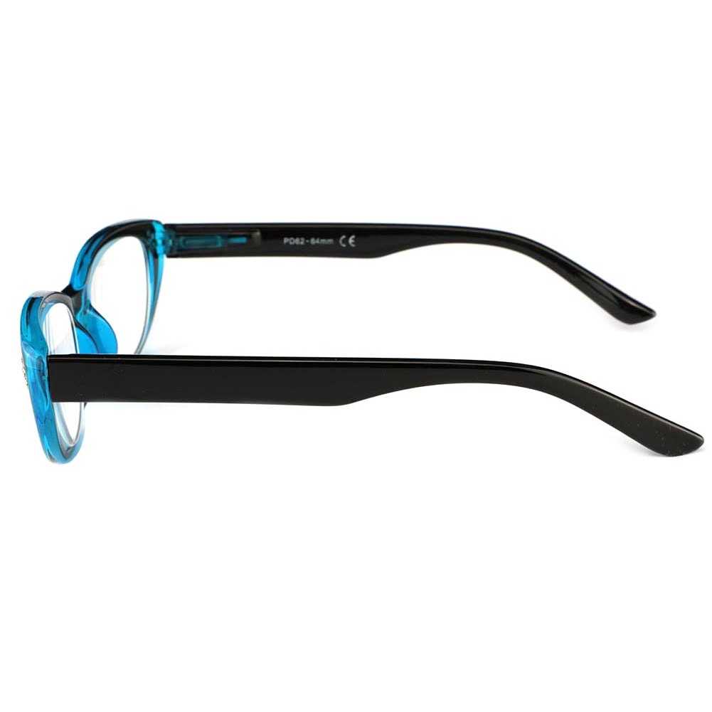 Lunettes loupes de la marque New Time modèle Lorca, ces lunettes de lectures ont une monture noir avec un intérieur bleu, d'inspiration moderne. Elles ont une correction dioptrie +3.5. Norme CE et NF EN 14139