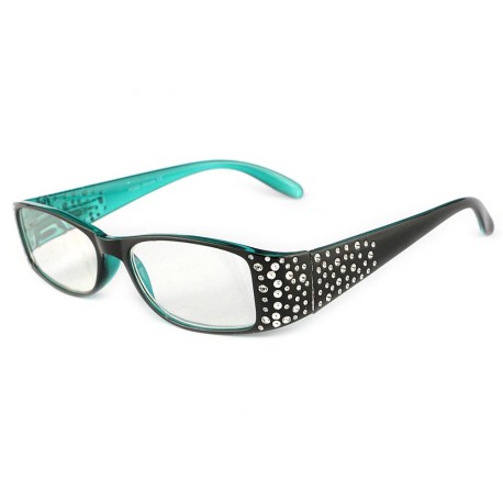 Lunettes loupes de la marque New Time modèle Star, ces lunettes de lectures ont une monture noire avec l'intérieur des branches bleu, sur les cotés on trouve des strass. Elles ont une correction dioptrie +1. Norme CE et NF EN 14139