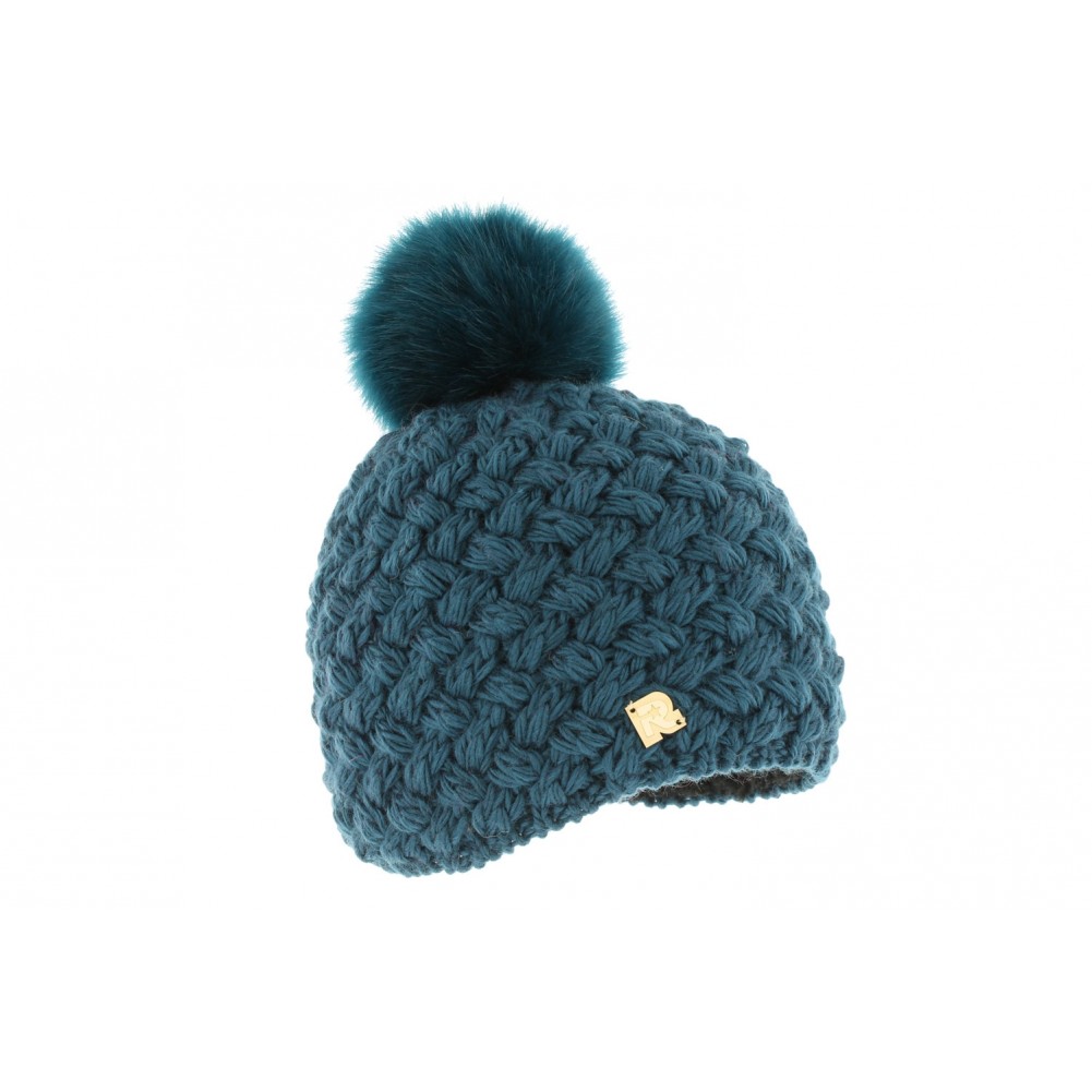 Bonnet pompon fourrure bleu pétrole, bonnet ski homme et femme en tricot laine croisée doublure polaire sélection Ice R Mountain