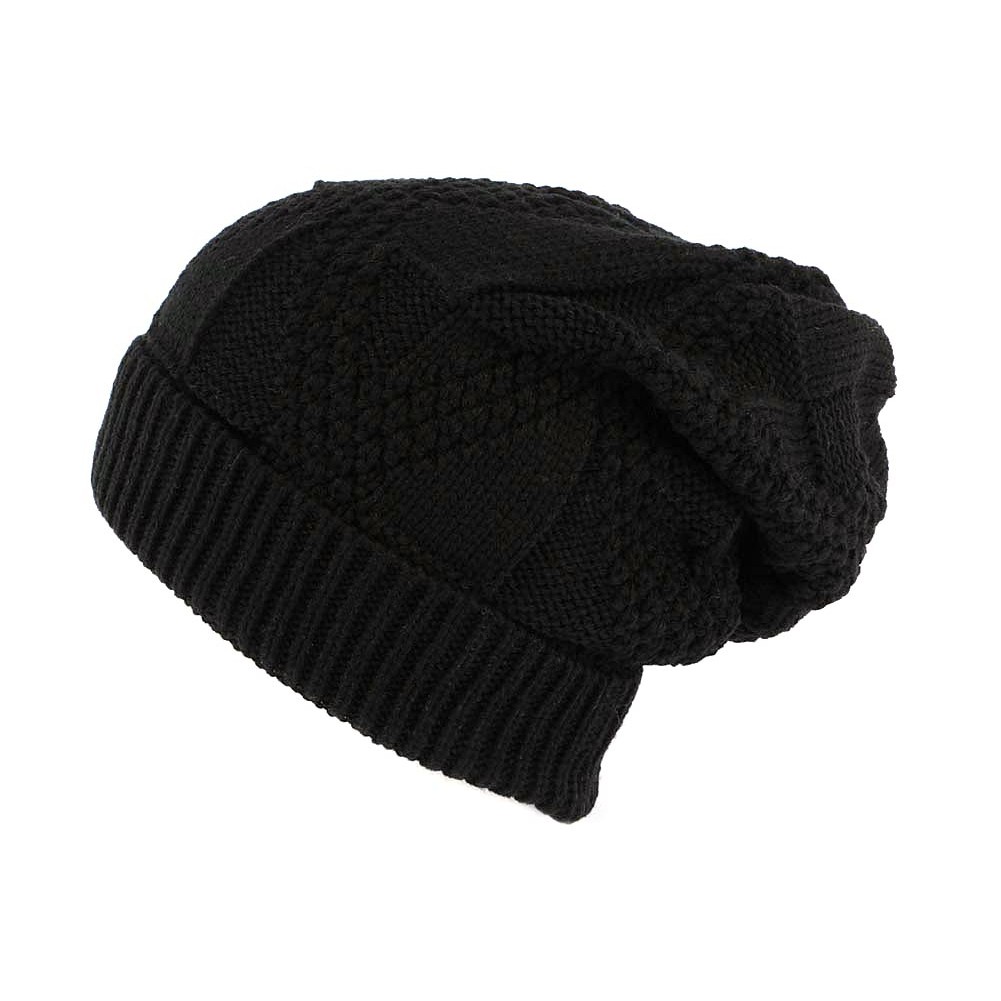 Bonnet rasta noir moèle Hopkins de marque Nyls Création. Ce bonnet long est en tricot de laine noire acrylique pour rester au chaud dans un écrin de douceur. Le design est en grand damier traversé par des croix rappelant un style Hipster mêlant classique et moderne, ce bonnet oversize est aussi agrémenté d'un revers.