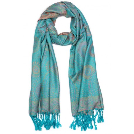 Echarpe Pashmina Bleu Azur modèle Bombay par Léon Montane. Ce châle est confectionné 100% pashmina, il est donc particulièrement doux et soyeux, léger et agréable. Le graphisme orangé et violet montre des dessins géométriques en cercle et des richelieux. De belle taille (70cm sur 200cm), ce foulard pashmina se porte au coup ou en étole.