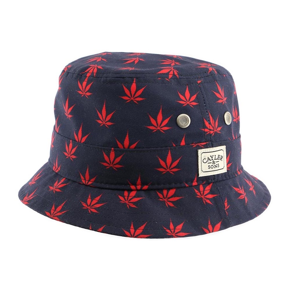 Bob de la marque Cayler and Sons modèle Leafs n Stripes, ce chapeau bob est en tissu bleu imprimé de petites feuilles rouges, sur le coté est cousu le logo de la marque Cayler avec des petites oeillets de respiration du cuir chevelu. Taille unique.