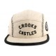 Casquette 5 panel de marque Crooks and Castles modème Players Club Ghost. Cette 5 panel skater et streetwear est en tissu beige clair en laine mélangée viscose pour un confort tout doux. Le graphisme de la casquette est des lignes simples et chics, sur le front de la casquette est cousu le logo Crooks Castles en lettres d'impimerie découpées dans un tissu noir, les logos stylisés CRKS et Team crooks sron brodés côté gauche de la casquette en noir et blanc, côté droit est brodé le slogan Players Club. Le top de la five panel est surpiqué noir pour finir le style baseball de la casquette. Le strap d'ajustement de la taille est en imitation cuir marron avec une boucle métallique.