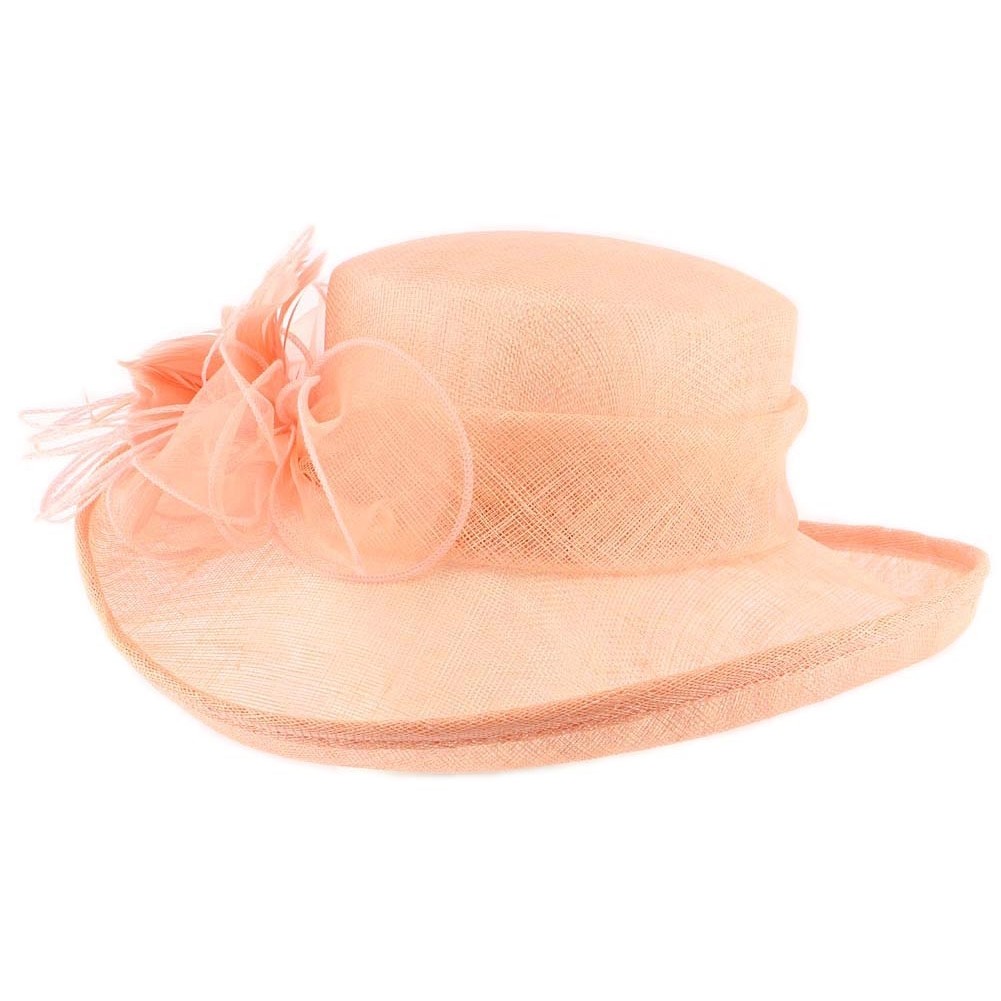 Chapeau mariage Rose saumon par Léon Montane modèle Bora, ce chapeau de cérémonie est en paille sisal, il est garni d'un tour de sisal autour de la calotte et d'une fleur sur le coté qui est un mélange d'organza de plumes et de fils de couleurs. Taille unique.