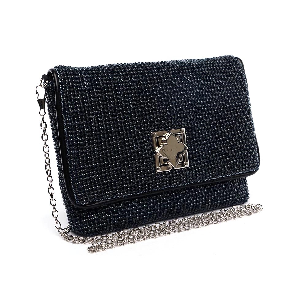 Minaudière Bleue de marque Léon Montane modèle Staka. Cette minaudière est en tissu entièrement recouvert de billes coloris bleu marine. Cette pochette femme pour mariage et réception se ferme par un rabat muni d'un fermoir argenté brillant en croix qui se tourne pour libérer le rabat. L'intérieur est doublé d'un tissu noir pour une finition soignée. Une petite chaine métallique amovible est fournie avec ce sac clutch pour le porter en bandoulière façon décontractée chic. Dimensions: 20*15*3 cm.