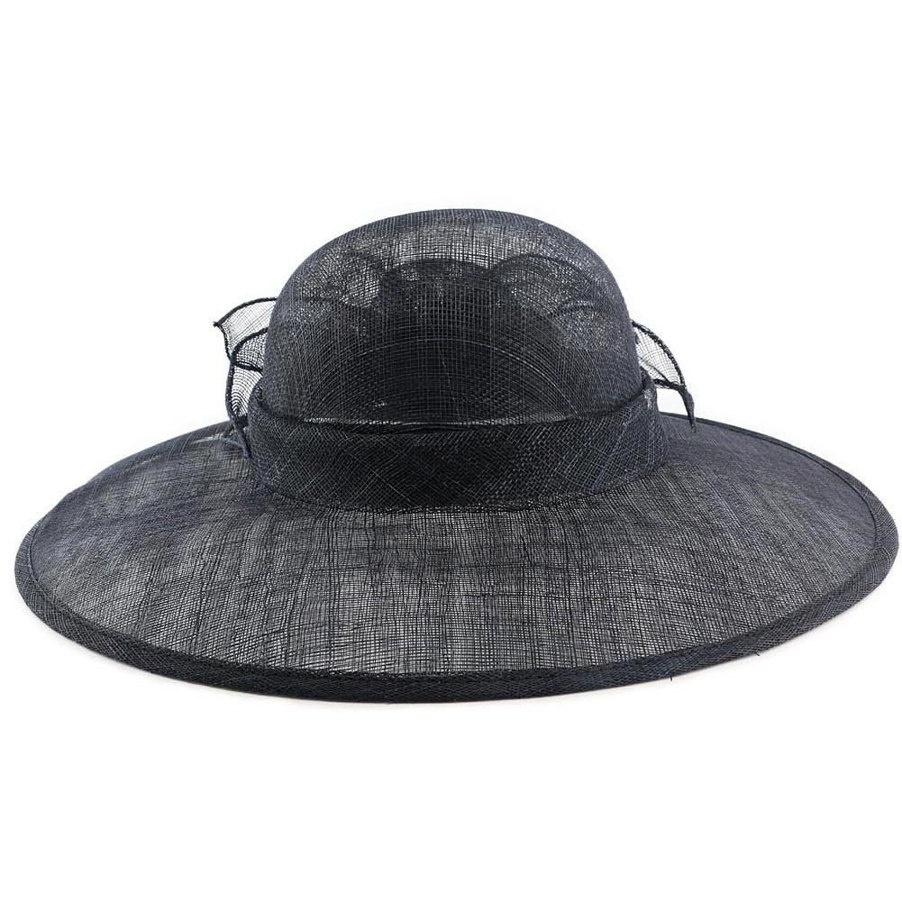 Chapeau mariage modèle Jewel par Léon Montane, cette grande capeline mariage est en sisal bleu marine, nous avons autour de la calotte un tour en sisal et une lame au bord. Sur le devant de ce chapeau cérémonie, nous avons une composition de fleurs en sisal avec des plumes. Taille unique.