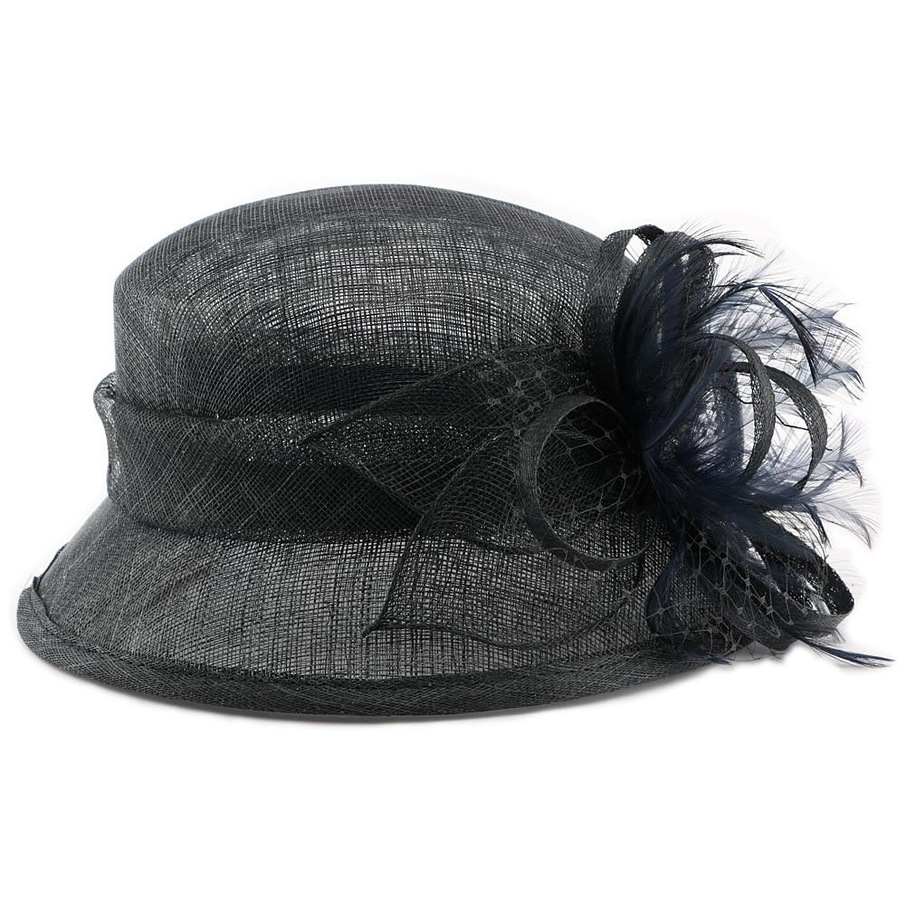 Chapeau de cérémonie par Léon Montane modèle Jeda, cette petite cloche est en paille sisal bleu marine. Ce chapeau mariage est garni d'un tour en sisal autour de la calotte sur le devant nous trouvons une composition en sisal avec un mélange de fleurs, de plumes et de voilettes. Taille unique.