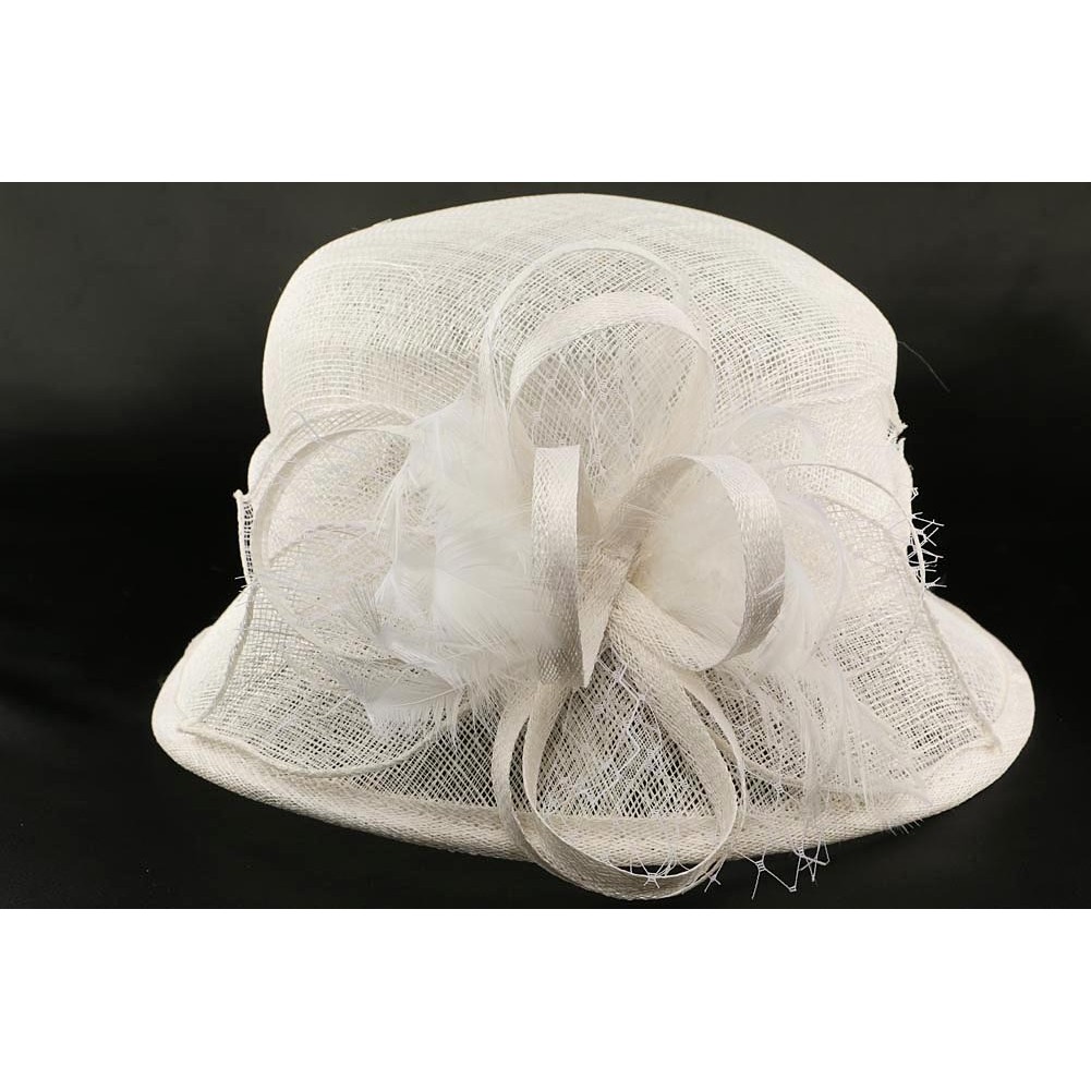 Chapeau mariage de la marque Léon Montane modèle Jeda, ce chapeau de mariée est en sisal blanc, il est garni d'un tour en sisal autour de la calotte. SUr le devant de ce petit chapeau rétro on trouve une composition faite de mélange de liens de sisal, de fleurs et de voilette. Taille unique.