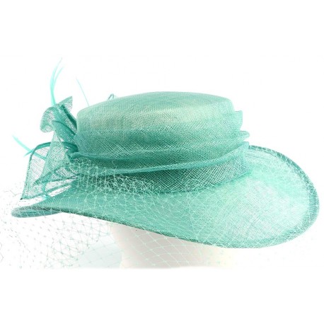 Chapeau mariage modèle Bella par Léon Montane, ce chapeau cérémonie est une capeline en sisal bleu, elle est garni sur le devant d'un voilette. A l'arrière nous avons une composition faite de mélanges de plumes et de fleurs de sisal. AUtour de la calotte nous avons un tour plissé en sisal. Taille unique.