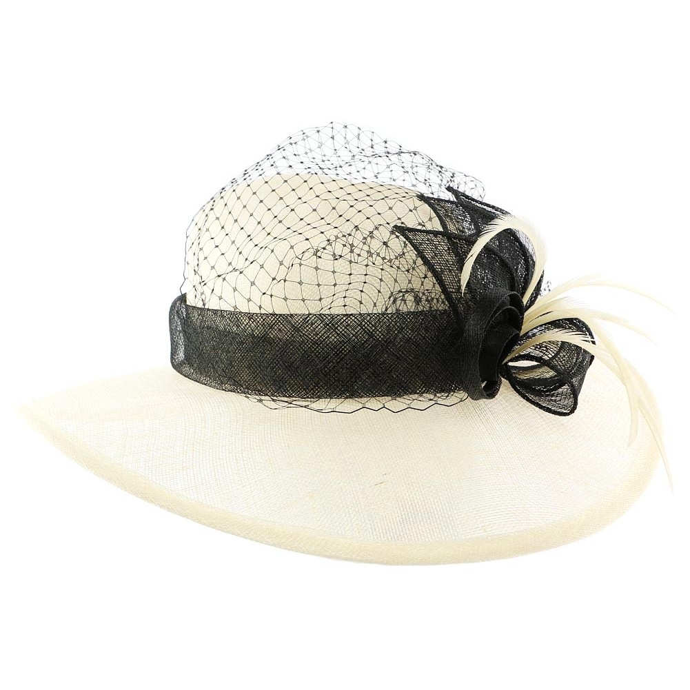 Chapeau mariage de la marque Léon Monntane modèle El paso, ce chapeau cérémonie est en sisal écru, il est garni tour en sisal noir. SUr le devant de ce chapeau nous avons une fleur plume écru avec une voilette noire. Taille unique.