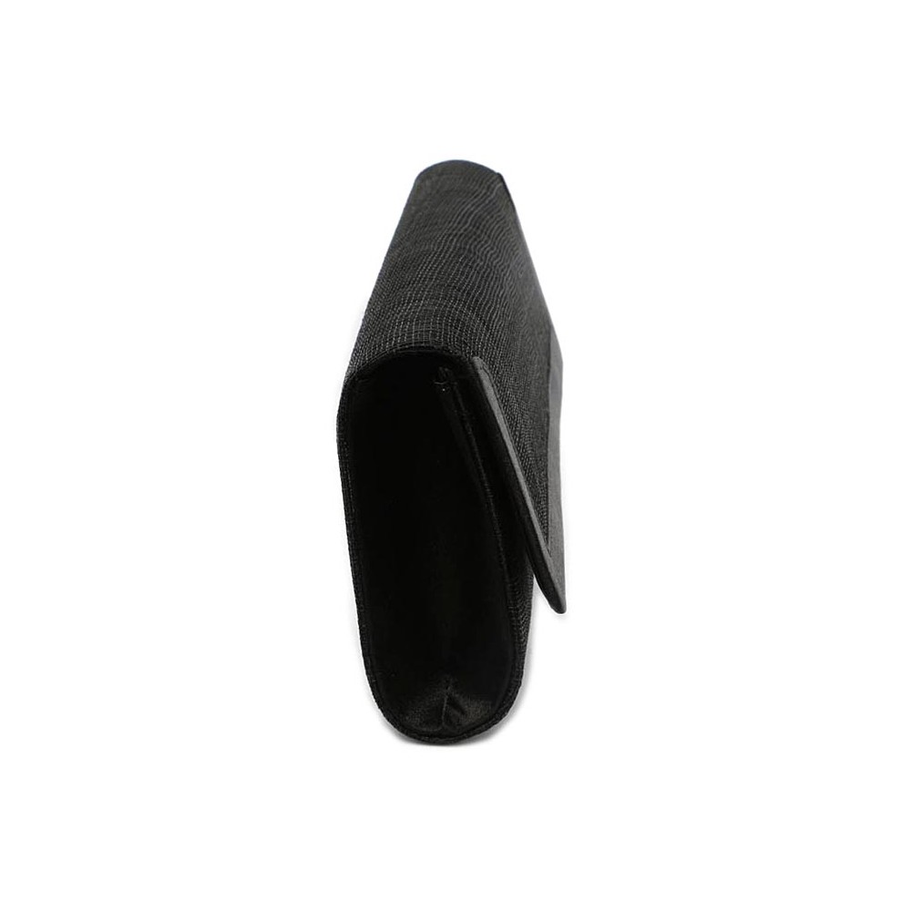 Pochette femme noire de marque Léon Montane modèle Ilka. Ce pochette mariage chic et sobre est confectionnée en paille de sisal naturelle coloris noir, ce sac de soirée est de forme rectangle avec côtés ovales aux dimensions de 25*12*4 cm. Un biais de satin noir entoure le rabat qui se ferme par un clip à aimant. L'intérieur est doublé d'un tissu noir et cette pochette de soirée dispose d'une poignée et d'une cordelette noire amovibles pour la porter au bras ou en bandoulière.