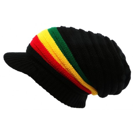 Bonnet Casquette Rasta noir de marque Nyls Creation modèle Jamaique. Ce bonnet long noir est tricoté en laine acrylique douce et chaude. Le style est efficace avec au dessus de la visière de cette casquette reggae un bandeau tricolore aux trois couleurs rastafari Jaune, Rouge et Vert. Ce bonnet rasta homme et femme taille oversize affiche un look cool et sobre pour toutes le saisons.