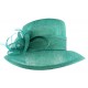 Chapeau mariage de la marque Léon Montane modèle Sico, cette capeline mariage est en paille sisal turquoise, nous trouvons autour de la calotte un double tour en sisal avec sur le coté une fleur en paille sisal avec des plumes. Taille unique.