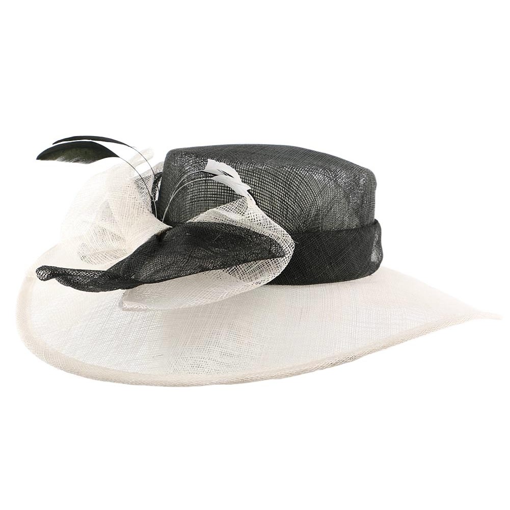 Chapeau de mariage modèle Bluch par Léon Montane, cette grande capeline de mariage est en paille sisal noire et blanche, on trouve un tour en sisal autour de la calotte, sur le devant nous avons un gros double noeud en sisal bicolor noir et blanc. Taille unique.