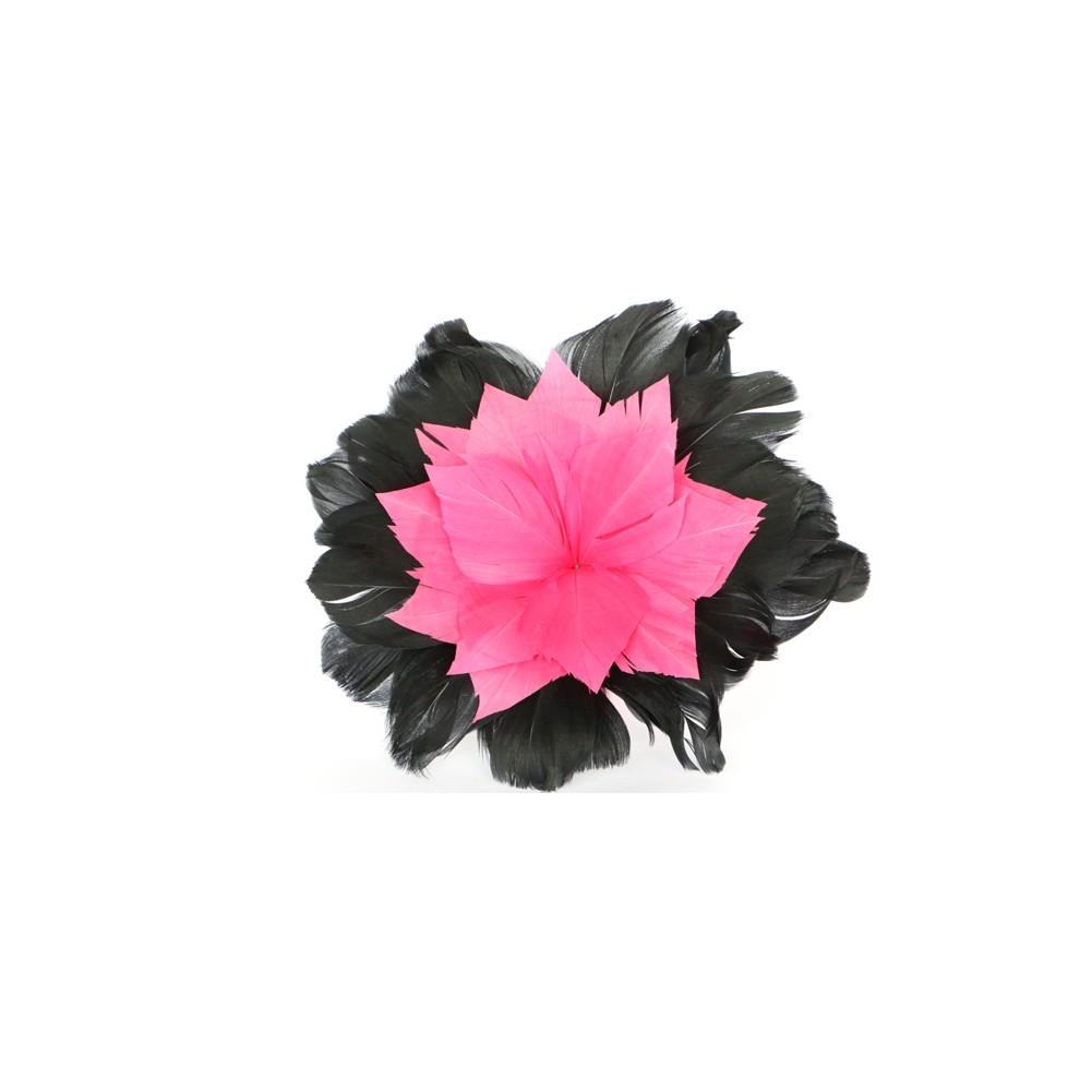 Coiffe de cérémonie élégante et originale, référence Alcée de la marque Leon Montane, cette coiffe est montée sur serre tête recouvert de stissu satiné noir. Elle est garnie d'une fleur en plumes noir au coeur rose. Ce modèle de création est un plus incontournable pour votre style lors de vos cocktails, cérémonies et autres mariages.