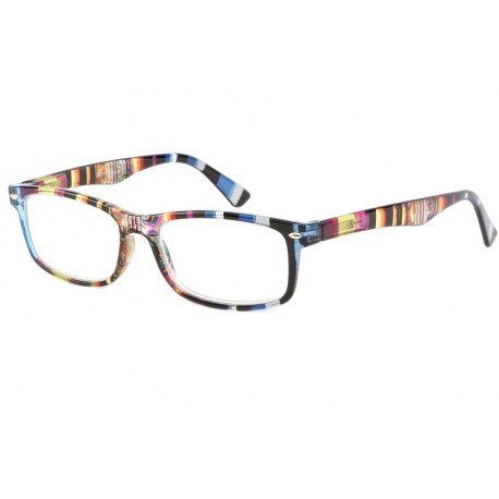 Lunettes Loupe de la marque New time modèle Gala, ces lunettes de lecture ont une monture bleu, jaune, rouge et orange avec de grosses rayures. Ces lunettes loupe ont une correction de dioptrie de +1.