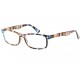 Lunettes Loupe de la marque New time modèle Gala, ces lunettes de lecture ont une monture bleu, jaune, rouge et orange avec de grosses rayures. Ces lunettes loupe ont une correction de dioptrie de +2.