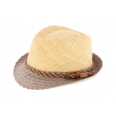 Chapeau de paille de la marque Herman Headwear modèle Powell, ce petit chapeau trilby est en paille naturelle et grise pour le bord, il est garni d'une fine tresse autour de la calotte avec le logo de la marque.
