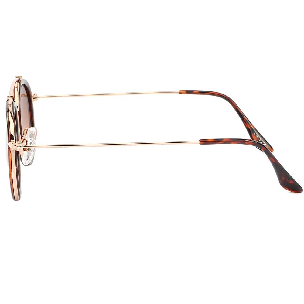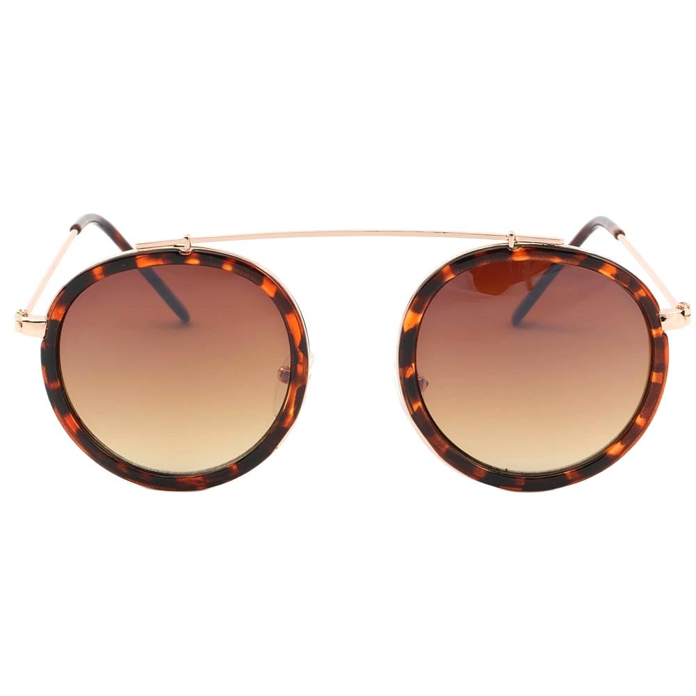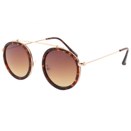 Lunettes de soleil de marque Eye Wear, modèle Hyla ecailles marron. Style tendance et élégant, ces lunettes de soleil homme et femme offrent une monture fine et légère en métal doré, les cercles sont douclés d'une épaisseur en plastique écaille marron pour une mode contemporaine et chic. Les cambres sont marrons et les verres fumés marron.