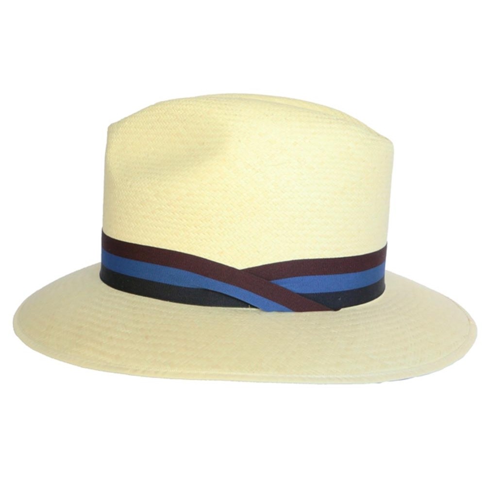 Chapeau de panama de chez Olney Headwear, modèle Bedford de couleur naturel. Cde chapeau panama est garni d'un ruban multicolore marron bleu noir dans la plus pure tradition anglaise. Ce détail en fait un chapeau d'été de style pour les moments ensoleillés en ville comme en campagne.